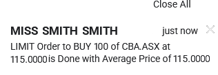 You place a Buy order to BUY 100 Commonwealth Bank (CBA.ASX) shares.